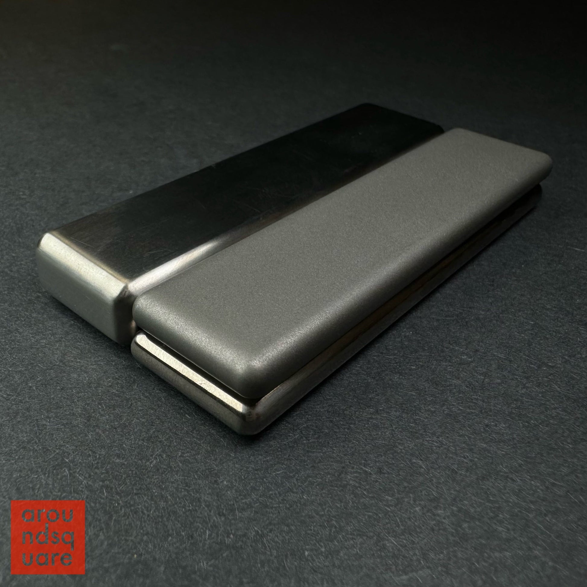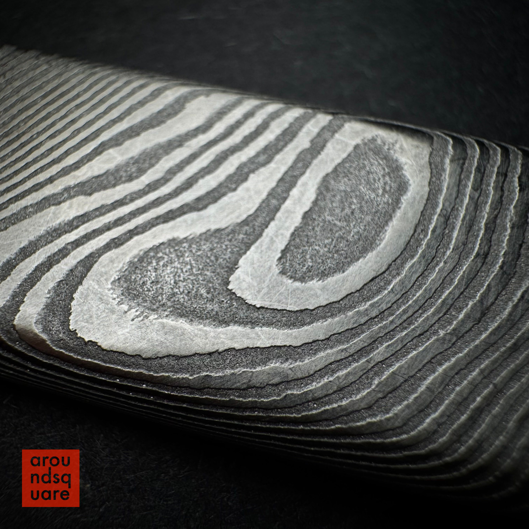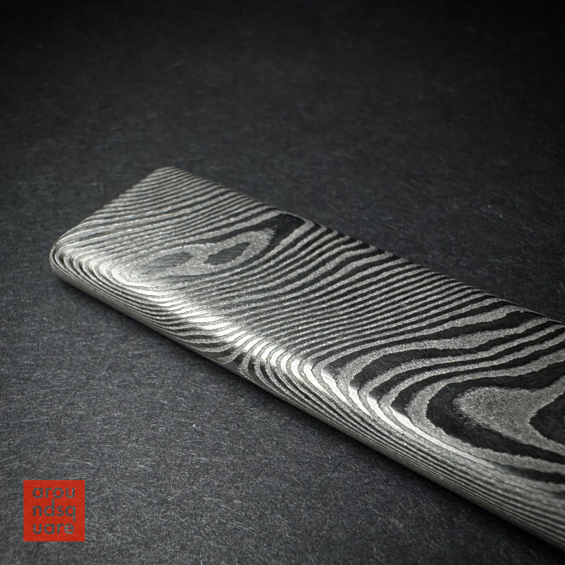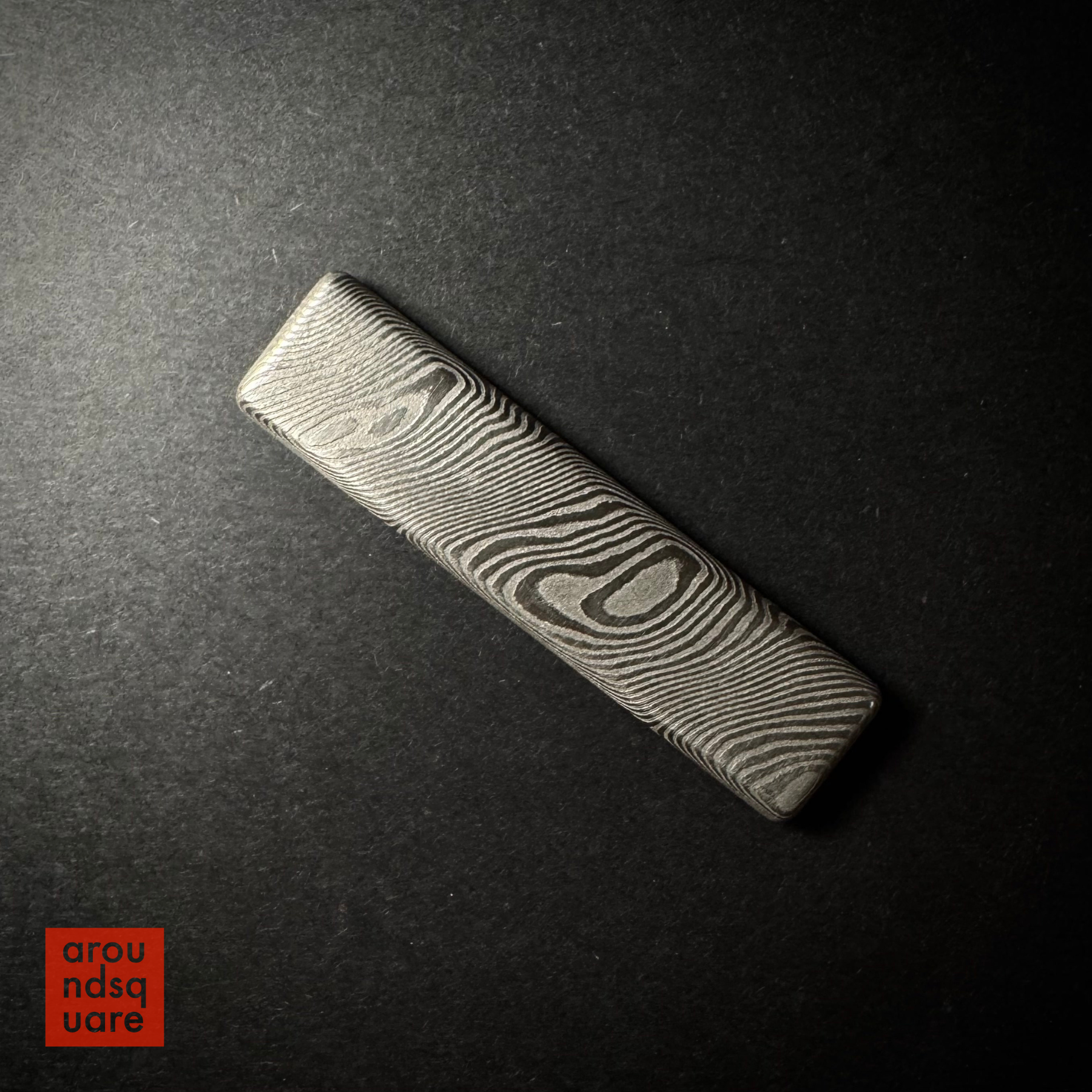 The damascus steel edition of our popular Demi Plank series is the first of our exotic materials. The damascus is beautifully etched, bringing out not only the topographic-style visual contours, but also a rich, organic-feeling texture, that facilitates grip during manipulations. The lovely grain of the damascus material makes this edition special in the range, and very satisfying just as a worry stone or totem in the pocket.. but of course it offers more. Although we lean away from framing the planks as skill toys, the combination of additional weight and grainy texture makes the damascus Demi a joy to manipulate.