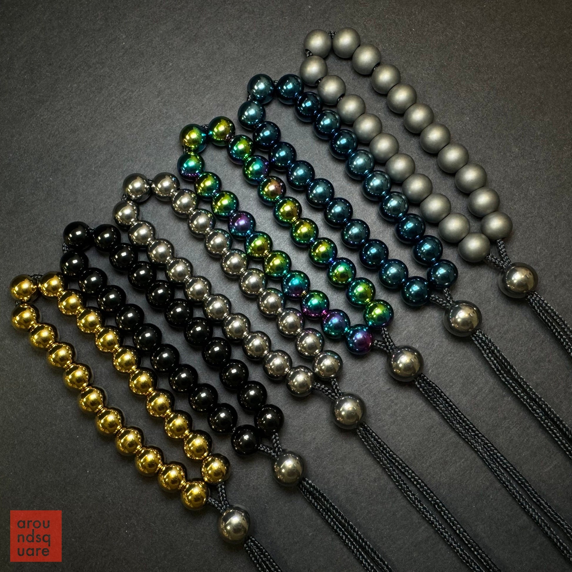 The unique setup of the MKUltras allows them to be worn like mala beads, or carried discretely in the pocket. They adjust by means of a simple friction fit through the larger "Micro Boss" bead closure. Although the design is exceedingly simple, we're fairly confident you won't find anything quite like them around. This is a knotless system, and does not require any special lock bead. The cord is simply compressed when threaded through the Micro Boss bead, providing a reliable, secure fastener, that is easy to adjust when needed.