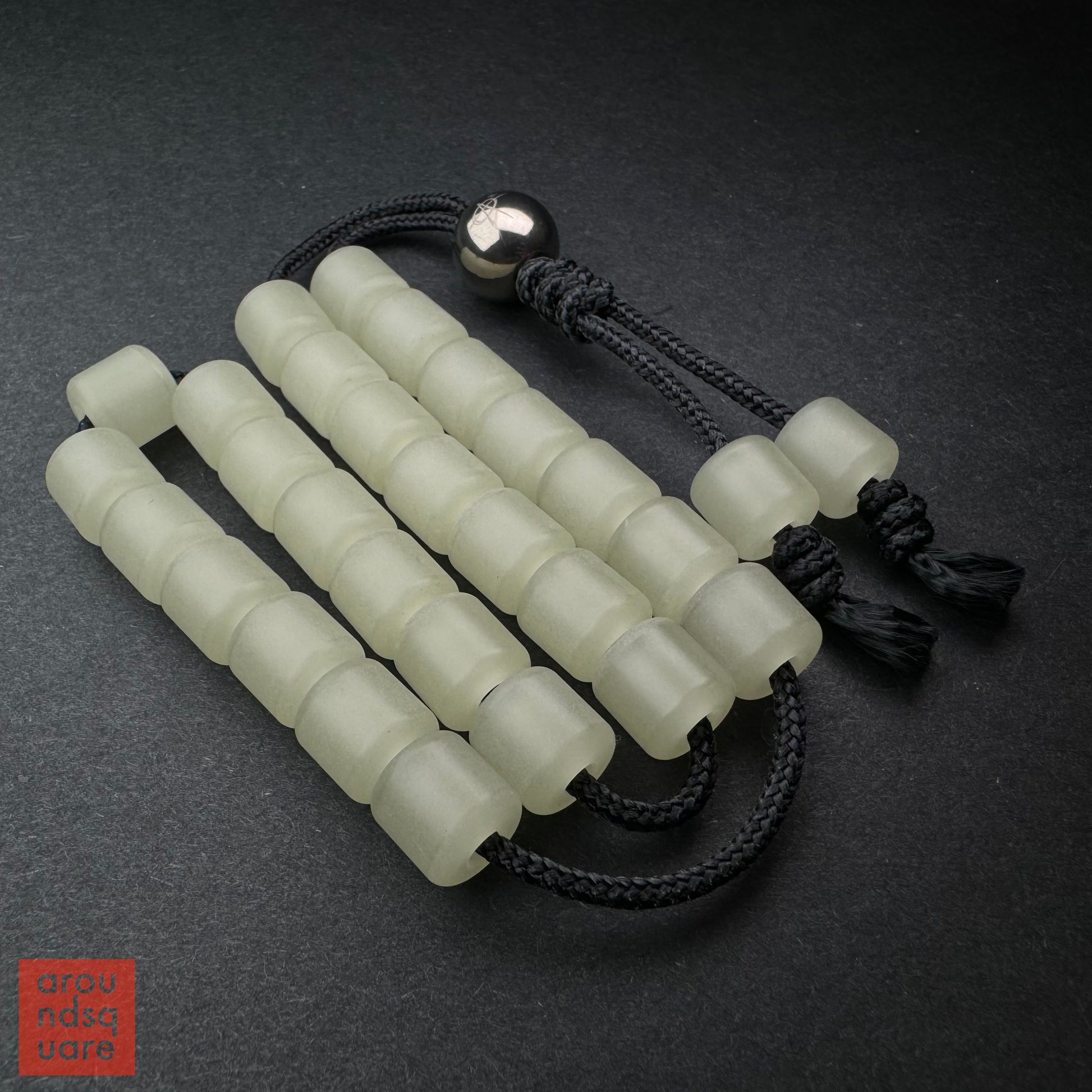 The unique setup of the MKUltras allows them to be worn like mala beads, or carried discretely in the pocket. They adjust by means of a simple friction fit through the larger "Micro Boss" bead closure. Although the design is exceedingly simple, we're fairly confident you won't find anything quite like them around. This is a knotless system, and does not require any special lock bead. The cord is simply compressed when threaded through the Micro Boss bead, providing a reliable, secure fastener, that is easy to adjust when needed.